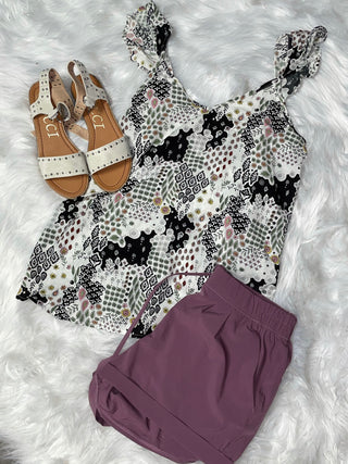 Paisley Vneck Ruffle Shoulder